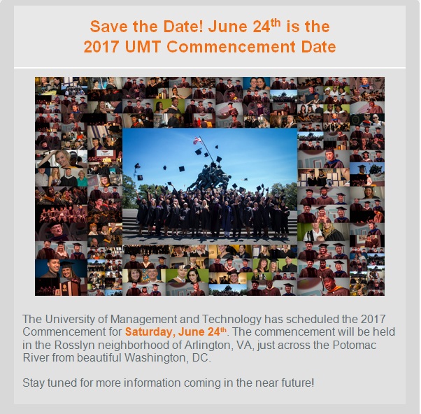 美国管理技术大学(UMT)订于2017年6月24日在美国首都华盛顿举行2017年校本部毕业典礼暨学位授予仪式,欢迎全球UMT学生参加。