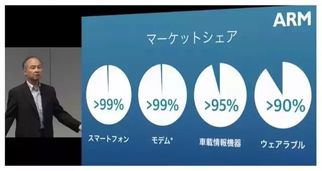 市场份额显示,ARM应用于智能手机>99%、调制解调器>99%、汽车导航仪>95%、可佩戴装备>90%