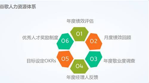 谷歌人力资源体系包含六大模块,分别是:年度绩效评估、月度绩效回顾、年度敬业度调查、年度经理人反馈、目标设定OKRs以及优秀人才奖励制度。
