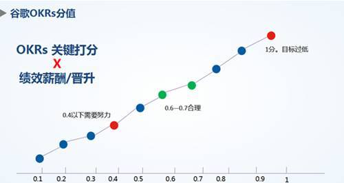 一般来说,1为总分的评分,达到0.6~0.7是比较合理的。如果0.4以下,说明你不及格还需要努力。如果你的目标得了一分,也就是你的目标是百分之百完成的话,谷歌反而会认为你的目标定的太容易、太低了,经理会里质疑你。谷歌OKRs分值示意图如下: