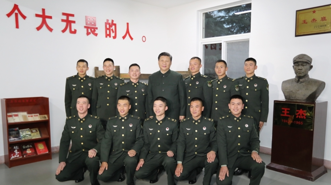 12月13日,中共中央总书记、国家主席、中央军委主席习近平到第71集团军视察。这是习近平同“王杰班”战士合影。
